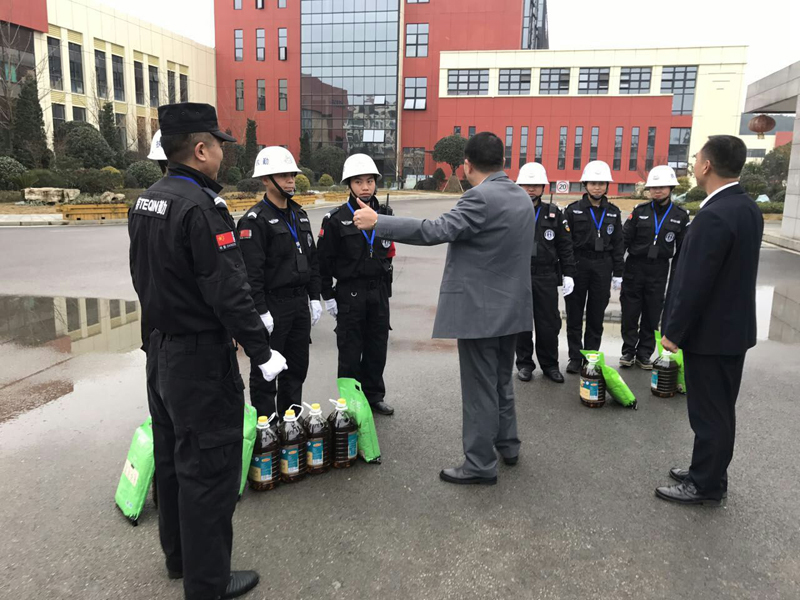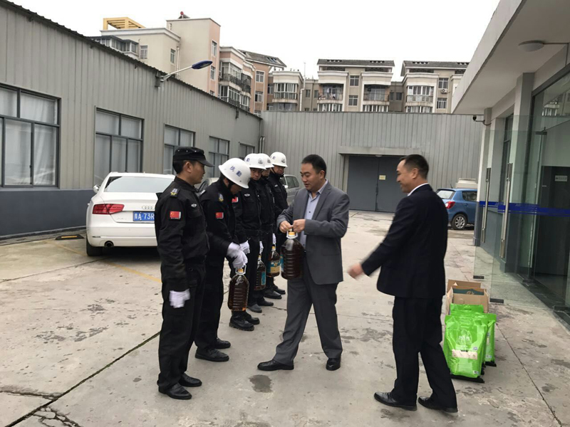 (陟翔集團(tuán)股東代表王訓(xùn)江和保安大隊(duì)長袁貴軍為各點(diǎn)保安員送上慰問品)