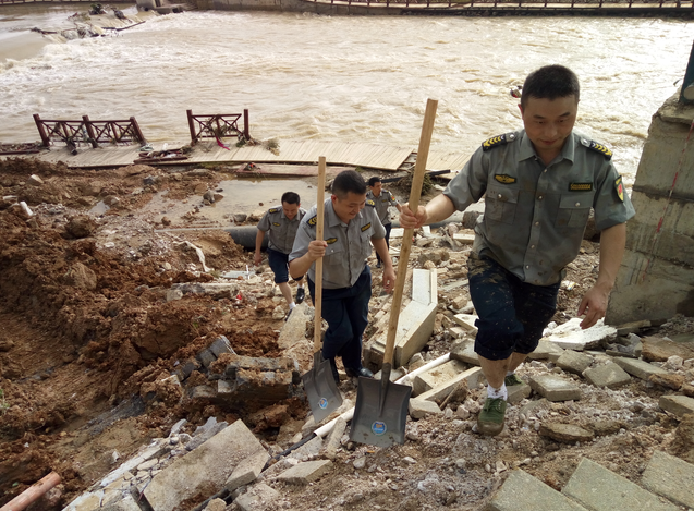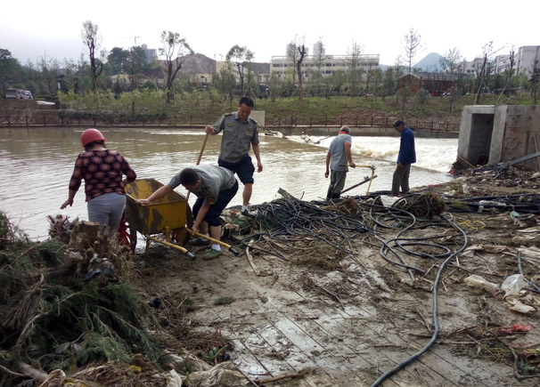 同時(shí),洪水還導(dǎo)致了沿河兩岸絕大部分的沿江步道被淹,綠化、亮化、沿線(xiàn)亭閣、景觀(guān)、護(hù)欄均被嚴(yán)重沖毀,河岸邊步道上留下了大量白色垃圾和淤泥。為了使災(zāi)后堆積的垃圾能夠盡快得到清理,小分隊(duì)與環(huán)衛(wèi)工人一起出動(dòng)清淤的同時(shí)還將被洪水沖毀的護(hù)欄邊的垃圾也一同清理干凈。