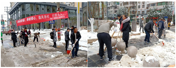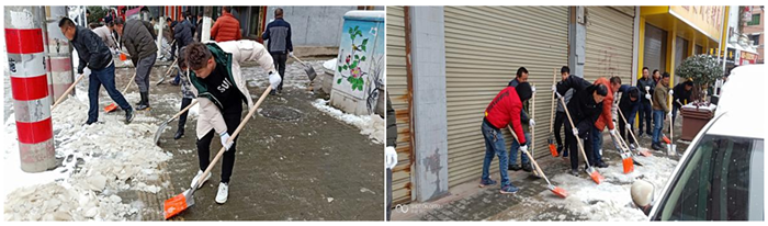 上午10點,員工們頂著風(fēng)雪,陸續(xù)來到公司。在項目部張總的帶領(lǐng)下,大家不畏嚴(yán)寒,揮舞著鐵鍬開始對縣城風(fēng)雨橋附近的人行道及斑馬線的積雪和結(jié)冰進(jìn)行清掃。大家你追我趕,齊心協(xié)力,配合默契,鏟的鏟、推的推、掃的掃,干的熱火朝天,不亦樂乎,忙碌的身影構(gòu)成了一道亮麗的風(fēng)景線。雖然室外溫度很低,但大家勞動的熱情和團(tuán)結(jié)的力量讓這個冬日變得格外溫暖。