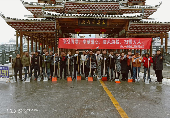 2018年12月29日晚間至12月30日白天,玉屏縣迎來立冬以來的第一場降雪。鵝毛般的大雪紛紛灑灑的落下,整個縣城猶如銀裝素裹,分外妖嬈!但是路面的積雪成冰,給市民出行帶來了諸多不便,為方便行人出行,31日上午,項目部行政人員和涉爆人員在項目部負(fù)責(zé)人的帶領(lǐng)下,開展了義務(wù)掃雪除冰活動。